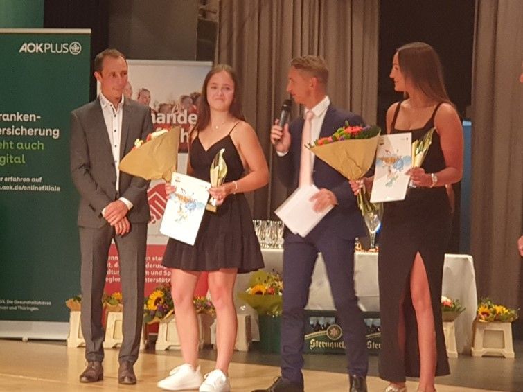 Mit dem Ergebnis ihres letzten Wettkampfes, Platz 3 zum World-Cup in Köln im Jahr 2021, konnte Gina Spranger (rechts) Voting bei den Frauen für sich entscheiden. Nach Aussage von Bundes- Stützpunkttrainer René Benirschke eine schöne Ehrung und Erinnerung. Die Trophäe wurde vom mehrfachen Olympiasieger und Weltmeister in der nordischen Kombination, Erik Frenzel überreicht.